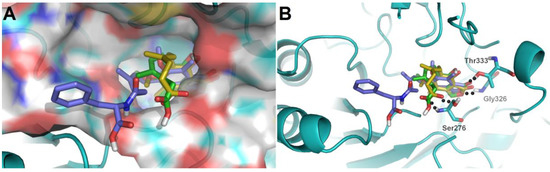 To further investigate their structure-activity relationships and modes of action, the binding modes and docking scores of compounds with IMPDH2 were obtained by molecular docking [20]. As shown in Figure 3, compounds 3 and 9 with considerable different levels on the activeness of enzyme were chosen to compare with MPA. The main skeleton was deeply buried into the binding pocket with several hydrogen bonds between these compounds and IMPDH2 observed, which included hydrogen bonds between the lactone oxygen (O-2) and the amide nitrogen of Gly326, and the carbonyl (C-1) oxygen and hydroxyl group of Thr333. Moreover, the hexenoic acid tail of 3 and MPA could adopt a bent conformation which allowed the carboxylate group to form hydrogen bonds with the amide nitrogen and side-chain hydroxyl groups of Ser276, thus the collective data from both bioassays and virtual docking revealed the importance of the hydrogen interactions in the immunosuppressive activity displayed by the MPA scaffold at both the enzymatic and cellular levels.