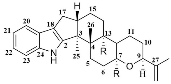 Indole-diterpene alkaloids are widely represented among the fungal metabolites. These compounds have been isolated from fungi of the genera Claviceps, Acremonium, Eupenicillium, Penicillium, and Aspergillus (including Emericella striata). Most natural indole-diterpenes have an invariable framework (Figure 1). Usually, C-7, C-13, and C-27 are oxidized. The oxygenation of C-27 is often followed by the formation of an ether bridge between C-27 and C-7 with inversion of the stereoconfiguration at C-7 [12]. Interestingly, some fungi produce metabolites with relatively rare features in the classical indole-diterpene backbone. For example, Acremonium lolii produces indoles diprenylated at C-20 and C-21, together with oxygenated derivatives [13]. Alkaloids with a 1,3-dioxane moiety joined at C-9 and C-10 with the F-ring from A. lolii have also been reported [14,15]. Many of such compounds showed tremorgenic [16], cytotoxic [17,18], and antiinsectan [19] activities, and some of them are antagonists of cannabinoid receptors [20].