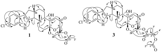 The 1H and 13C NMR spectra of 1 (Table 1) resembled those of paspalinine [16], suggesting that 1 has an indole-diterpene core similar to that of paspalinine. However, the differences in chemical shift values of C-19 (δC 123.3) and C-22 (δC 123.7) of 1 from the corresponding carbons in paspalinine [16]; the HMBC correlations (Figure 2, Figure S5) from H-20 (δH 7.26) to C-18 (δC 115.0) and C-22, from H-21 (δH 7.26) to C-19 and C-23 (δC 111.3), and from H-23 (δH 7.26) to C-19 and C-21 (δC 118.7); and the coupling constants JH20–H21 (8.5 Hz) and JH21–H23 (2.1 Hz) suggested the presence of a chlorine atom on C-22 of 1.