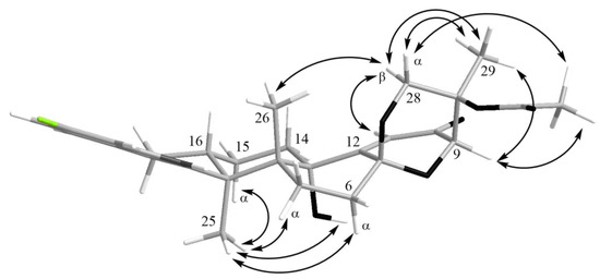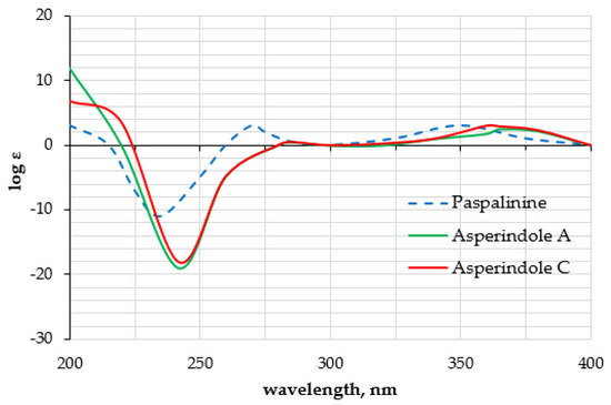 The HMBC correlations (Figure 3, Figure S5) from H-28β (δH 3.67) to C-27 (δC 75.0), C-29 (δC 17.0), and C-1′ (δC 170.2); from H-9 (δH 4.74) to C-7 (δC 93.6), C-28 (δC 64.8), and C-27; from H-28α (δH 4.04) to C-7, C-9 (δC 78.3), and C-27; and from H3-29 (δH 1.21) to C-27 suggested the presence of a 1,3-dioxane ring with an acetoxy group at C-27. The W-type coupling constant JH9–H28α (2.5 Hz) and ROESY correlations (Figure 4, Figure S6) of H-28β with H-11 (δH 6.11), H3-29, H3-26 (δH 1.02), and of H-28α with H3-29 indicated a relative configuration of chiral centers in the 1,3-dioxane ring as 7R*, 9R*, 27S*. The ROESY correlations (Figure 4, Figure S6) of H3-25 (δH 1.31) with H-5α (δH 1.93), 13-OH (δH 5.10), H-6α (δH 2.00), and H-15α (δH 1.91), and of H-16 (δH 2.72) with H3-26 (δH 1.02) suggested the relative configurations of the stereogenic carbons of the C–G rings in 1 as 3S*, 4R*, 13S*, 16R*. The absolute configurations of all stereocentres in 1 was proposed as 3S, 4R, 7R, 9R, 13S, 16R, 27S—the same as those in paspalinine—based on biosynthetic considerations, and was confirmed by the comparison of the ECD (electronic circular dichroism) spectral data with that of paspalinine [17] (Figure 5). Compound 1 was named asperindole A. It should be noted that chlorinated indolediterpenes are rare in nature [12,22,23,24,25].