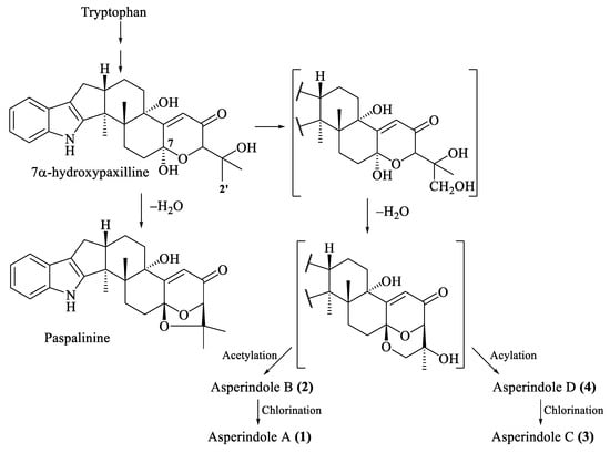The biosynthesis of related indole-diterpenes was previously proposed for paspalinine [29]. Apparently, the common biosynthetic precursor of asperindoles and 1,3-dioxolane indole-diterpenoids (including paspalinine) is 7α-hydroxypaxilline (Figure 7). Oxidation of the isopropyl substituent, followed by cyclization at С-7 and С-2′, generates a 1,3-dioxane ring. Asperindoles are then formed by acylation and halogenation.