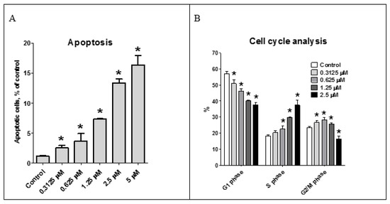 The cell cycle distribution was analyzed by flow cytometry using PI (propidium iodide) staining as described before with slight modifications [32]. In brief, cells were preincubated overnight in 6-well plates (2 × 105 cells/well in 2 mL/well). The medium was changed to fresh medium containing different concentrations of the substances. After 48 h of treatment, cells were harvested with a trypsin-EDTA solution, fixed with 70% EtOH, stained, and analyzed by BD Bioscience FACS Calibur analyzer (BD Bioscience, Bedford, MA, USA). The results were quantitatively analyzed using BD Bioscience Cell Quest Pro v.5.2.1. software (San Jose, CA, USA). Cells detected in the sub-G1 peak were considered as apoptotic.