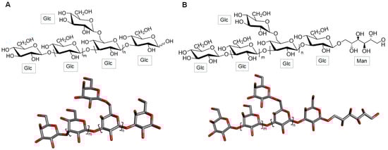 Representative chemical structure of laminaran which is composed of a backbone of 3-linked β-d-glucose (Glc) units with possible 6-linked branches of Glc residues and with reducing terminal ends with (A) Glc units (laminaran type G) or (B) D-mannitol (Man) residues (laminaran type M).
