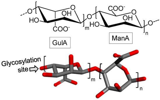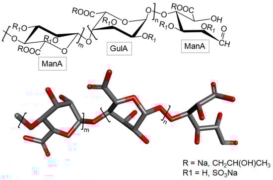 Alginic acid is a polysaccharide obtained from brown algae. It has linear structure and consists of β-d-manuronic acid (ManA) and α-l-guluronic acid (GulA) in repeating building blocks. These building blocks may be composed of consecutive GulA residues [GulA-GulA-GulA-GulA]n, consecutive ManA residues [ManA-ManA-ManA-ManA]n, or alternating ManA and GulA residues [GulA-ManA-GulA-ManA]n (Figure 2) []. This polysaccharide has a wide spectrum of application in medicine, in the food industry, in biotechnology and in other industrial sectors [].