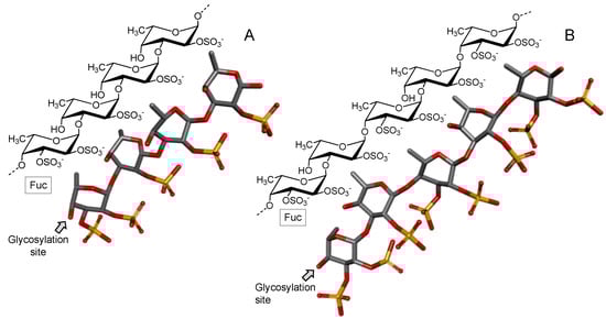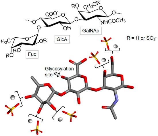 Fucosylated chondroitin sulfate (fCS) is a distinct marine GAG found exclusively in sea cucumber (Echinodermata, Holothuroidea). This GAG is composed of the regular CS backbone with branches of α-l-Fuc units attached to C-3 of the GlcA residues (Figure 9). The lateral units of Fuc can show different patterns of sulfation according to the holothurian species [,].