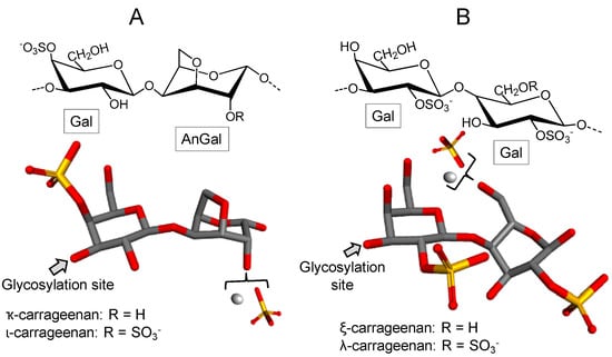 Carrageenans are sulfated galactans found in red seaweeds and composed of linear chains of alternating 3-linked β-d-Gal (conventionally ascribed as A units) and 4-linked α-d-Gal or α-d-3,6-anhydrogalactose (AnGal) (B units), thus forming disaccharide-repeating building blocks [].