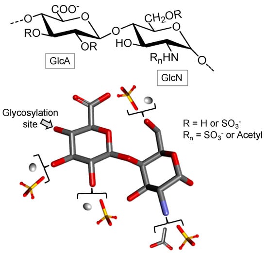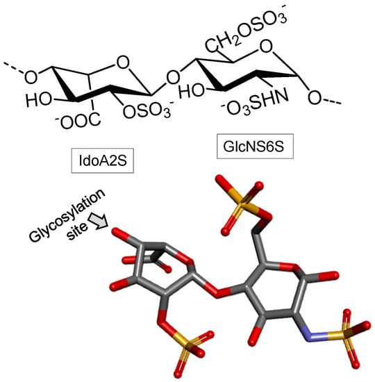 Heparin and Heparan sulfate (HS) are structurally related GAGs since both are composed of GlcN units in their backbones, although with different concentrations []. HS is typically considered a less-modified heparin version. Among the sulfated GAGs, HS has the greatest structural variability. Depending on the tissue and species of origin, such a polysaccharide may be composed of several distinct disaccharide units, containing either GlcA or IdoA and GlcN with different extents of N- and/or 6-O-sulfation besides N-acetylation and 3-O-sulfation [].