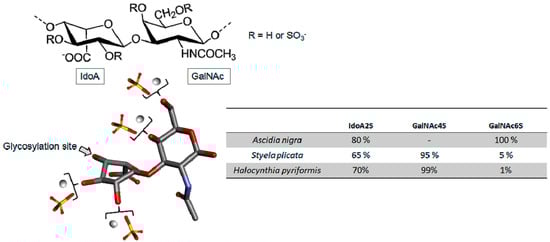 In addition of being present in mammalian tissues, DS with high sulfation content was also found in different species of clam and tunicate [,,]. The work of Pavão et al. [] raised an interesting discussion about the structure-function relationship of DS, extracted from different species of ascidians (Figure 8). For example, DS isolated from Ascidia nigra is fully sulfated at C-6 of the GalNAc unit (100%) and at C-2 of IdoA (80%) (Figure 8). The DS from S. plicata however is less sulfated at C-2 (65%) and widely sulfated at the C-4 position of GalNAc (Figure 8). The DS, isolated from Halocynthia pyriforms, is similar to that of S. plicata (Figure 8).