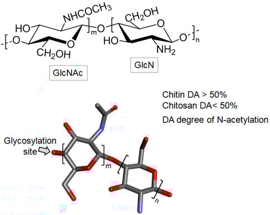 Chitosan is a cationic polysaccharide composed of the same units and the glycosidic linkage of chitin (Figure 11). However, low amounts of GlcNAc are found in chitosan, usually less than 50%. Physicochemical characteristics such as hydrophobicity and inter-chain interactions depend on the amount and distribution of the acetyl groups [,].