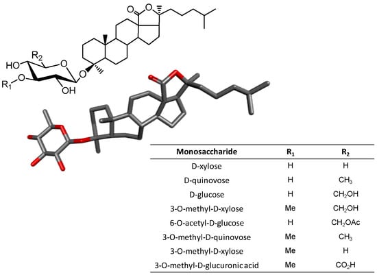 - Kalinin, V.I.; Ivanchina, N.V.; Krasokhin, V.B.; Makarieva, T.N.; Stonik, V.A. Glycosides from marine sponges (porifera, demospongiae): Structures, taxonomical distribution, biological activities and biological roles. Mar. Drugs 2012, 10, 1671–1710. [Google Scholar] [CrossRef] [PubMed]