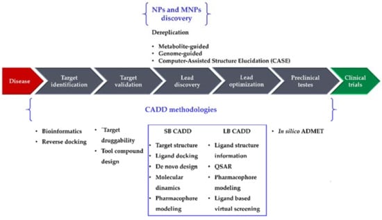 Drug research and development (R&D) is comprehensive, complex, expensive, time-consuming, and full of risk. A 2016 study [1] reported a clinical success rate, i.e., the likelihood that a drug that enters clinical testing will eventually be approved, of approximately 12%. The development of a drug from concept to market currently takes 13–15 years and requires United States $2–3 billion on average [2]. Although such costs are going up, the number of drugs approved every year per billion dollars spent on R&D has remained flat or decreased for most of the past decade [3]. Several new methodologies have been developed and applied in drug R&D to shorten the research cycle and to reduce the costs. Computational methodologies have been instrumental at various stages of drug discovery [4,5] and continue to be indispensable in the incessant demand for life-saving drugs. Computer-Aided Drug Design (CADD) methods have emerged as a powerful tool in the development of therapeutically important small molecules for over three decades [6,7,8], enabling higher hit rates than experimental high-throughput screening (HTS) approaches alone [6]. For example, Mueller et al. [6] built a computational model using results from a previous HTS of metabotropic glutamate receptor 5 (mGlu5) activity [9], which was able to identify new lead-like mGlu5 modulators in a virtual screening experiment with a hit rate of 3.6% [6]: an enrichment factor of approximately 16 compared with the original experimental HTS data (0.22%) [9]. Nowadays, CADD methodologies have been extended from their more conventional application of lead discovery and optimization toward new directions, e.g., target identification and validation and preclinical tests (prediction of adsorption, distribution, metabolism, excretion, and toxicity (ADMET) properties). They are generally classified in two categories, structure-based (SB) and ligand-based (LB), both of which have been used with marine natural products (MNPs). In this review, we highlight recent advances of CADD methodologies applied to NPs (particularly focusing on MNPs), as well as the importance of informatics in the analysis of marine extracts from an early stage of screening, to recognize and filter out known compounds (dereplication) [10,11]. Figure 1 illustrates the role of computational methodologies in a typical drug discovery pipeline and the importance of NPs and MNPs in this context.