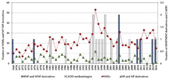 Statistics concerning novel drug approvals by the Food and Drug Administration (FDA) during 1969–2016 show a current downward trend since the high-point in 1996 (53 new molecular entities (NMEs)/year), and the minimum (after 1996) of 15 NMEs/year in 2010 and 2016. Figure 2 compares the global number of novel FDA approvals with the number of approvals of NP and derivatives between 1969 and 2016 and highlights the contribution of MNPs and CADD methodologies.