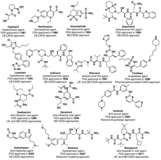 Novel Food and Drug Administration (FDA) approvals during 1969–2016, where new molecular entities (NMEs) are all approvals except biologics license applications; NP and derivatives are all non-mammalian NPs except MNPs; CADD methodologies are approvals that were developed using CADD; * an MNP that is an European Medicines Agency (EMEA)-approved drug. Data are from Drugs@FDA and the literature [7,12,13,14,15,16,17].