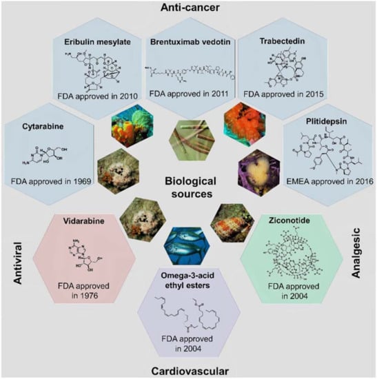 More than half of the total approvals of MNP and derivatives occurred in the 21st century (six out of eight approved drugs, Figure 4). The declining number of NMEs in development pipelines together with the higher success rate of marine compounds (1 in 3500 MNPs [13] against the industry average of 1 in 5000–10,000 compounds [23]) have led to the rekindling of interest in NP-like scaffolds [23,24]. More than 28,000 MNPs have been reported to date from a variety of marine sources (http://pubs.rsc.org/marinlit); in 2016, the literature reported 1277 new compounds [25] isolated from marine microorganisms and phytoplankton, green, brown, and red algae, sponges, cnidarians, bryozoans, molluscs, tunicates, echinoderms, mangroves, and other intertidal plants and microorganisms. However, only eight MNPs have to date been approved as drugs (Figure 2 and Figure 4), while 12 marine-derived metabolites are currently in different phases of clinical trials [25,26,27,28,29]. New approaches are needed to overcome the perceived disadvantages of NPs as compared with synthetic drugs, such as the difficulty in access and supply, the complexity of NP chemistry, and the inherent slowness of working with NPs [28,30]. Existing NP databases must be improved by filling missing activity records [31]. It shall be mentioned that the known biological activity space of MNPs has been biased due to funding sources, e.g., five out of the eight approved MNPs drugs are anti-cancer drugs (Figure 4). The emphasis on cancer is mainly due to the fact that the major funding agency in the U.S. for MNP and derivatives was for many years the National Institutes of Health (NIH)/National Cancer Institute (NCI), and this happened similarly in other countries [13].