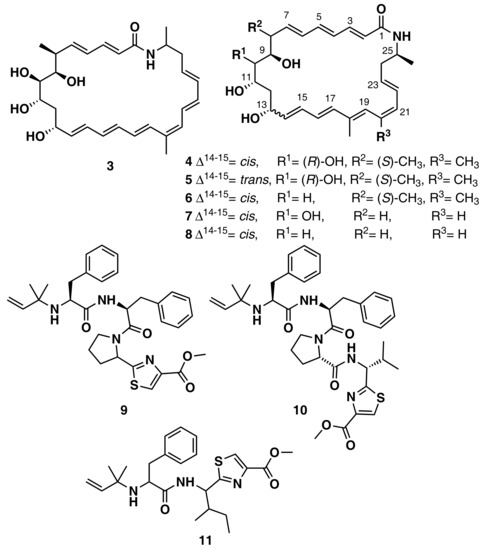 Ziemert et al. reviewed the evolution of genome mining in microbes and included an extensive list of examples where genome mining has directly led to the identification of metabolites [86]. For example, the discovery of the polyene macrolactam salinilactam A (3) (Figure 6) demonstrates the powerful interplay between genomic analysis and traditional studies of NP chemistry. The salinilactam gene cluster is the biggest gene cluster detected by bioinformatic analysis in the marine actinomycete Salinispora tropica CNB-440 genome [90]. The detection of the compound was possible based on putative structural features (characteristic UV chromophores) suggested by the initial inspection of the partial gene cluster. Then, the structural fragments and the molecular formula obtained by MS for an isolated product suggested a 10-module polyketide synthase (PKS) enzyme responsible for the biosynthesis of the compound, which facilitated assembly and therefore closure of the genome. Finally, further bioinformatic analysis of enzymatic domains refined the structure elucidation of the compound. A similar strategy was followed by Schulze et al. [91] and enabled the discovery of a family of macrolactams from a marine actinomycete, Micromonospora sp. (lobosamide A (4), B (5), and C (6) are illustrated in Figure 6), as well as mirilactam A (7) and B (8) from a distantly related actinobacterium, Actinosynnema mirum. A genome mining study reported the identification of 31 cyanobactin gene clusters from 126 genomes of the marine cyanobacteria Microcystis aeruginosa PCC 9432 and Oscillatoria nigro-viridis PCC 7112 [92]. Cyanobactins are a growing family of cyclic ribosomal peptides produced by cyanobacteria, which have exhibited cytotoxic activity against cancer cell lines as well as antiviral, antimalarial, and allelopathic activities. Bioinformatic analysis of the genomes predicted that the strains produce cyanobactins with chain lengths of 3, 4, and 5 amino acids and containing thiazoles (the core encoded a cysteine and the gene cluster encoded heterocyclase and oxidase enzymes). Extensive chemical analyses demonstrated that some cyanobacteria produce short linear peptides with a chain length ranging from three to five amino acids. Three novel linear peptides, aeruginosamide B (9) and C (10) and viridisamide A (11) (Figure 6), were isolated, which were N-prenylated and O-methylated on the N and C termini, respectively.