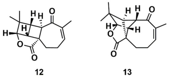 Liu et al. [112] proposed a protocol comprising the confluence of capabilities embodied by CASE methods, DFT calculations, and measurement of anisotropic NMR parameters (RDCs and RCSA) aiming at the growing general problem of structural mischaracterization. The authors demonstrated that the combination of RDCs and RCSAs provides a powerful orthogonal mean of confirming not only the relative configuration of a given stereocenter, but also the overall molecular structure and atomic connectivity of a molecule [112]. The protocol was applied to several examples of revised structures, including aquatolide, a sesquiterpene lactone isolated from the hexane extract of Asteriscus aquaticus. In 1989, a very rare ladderane moiety was proposed [113] for the aquatolide (12) (Figure 8). However, more recently, the proposed chemical structure of the aquatolide (12) was revised on the basis of quantum-chemical calculations and NMR experiments to the unusual core structure (13) (Figure 8) [114]. The revised structure of aquatolide was subsequently confirmed by X-ray crystallography [114] and by total synthesis [115]. Liu et al. compared the experimental and back-calculated RDC/RCSA data for the model structures (12) and (13) (Figure 8) and readily established that the revised structure (13) is in best agreement with the data [112].