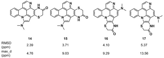Synergistic combinations of CASE algorithms and DFT calculations of chemical shifts have been reported that broaden the range of amenable structural problems to encompass proton-deficient molecules, molecules with heavy elements (e.g., halogens), conformationally flexible molecules, and configurational isomers [116,117,118]. Buevich and Elyashberg [118] illustrated this approach with previously established structures; one example is cycloshermilamine D (14) (Figure 9), a pyridoacridine alkaloid isolated from the marine tunicate Cystodytes violatinctus [119]. The ACD/Structure Elucidator system processed the experimental data, consisting of the molecular formula, 1D proton and carbon spectra, and 2D NMR data (COSY, HSQC, and HMBC), and yielded 263 candidate structures. The four top candidates included the structure of cycloshermilamine D at the first position, but the other three candidates had very similar sets of carbon chemical shift deviations. DFT calculations of carbon chemical shifts for the four structures were performed at the mPW1PW91/6-311 + G(2d,p) level of the theory, unequivocally showing that the first structure had the lowest root mean square deviation (RMSD) (13C) and the smallest maximum chemical shift deviation, which convincingly supported the structure of cycloshermilamine D without any additional experimental data.