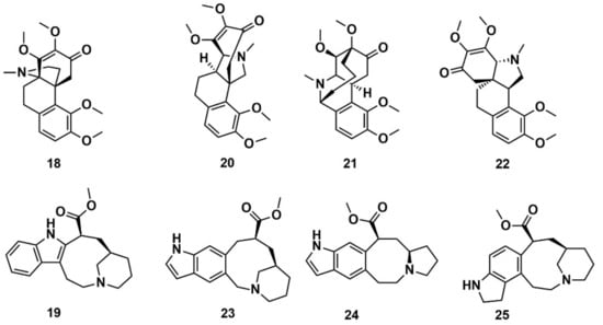 Reymond and co-workers [144] enumerated possible organic saturated or aromatic ring systems with up to 4 cycles and 14 atoms to obtain the so-called GDB4c database containing 916,130 ring systems. This was further processed to generate all possible stereoisomers, yielding a GDB4c3D database with 6,555,929 compounds. Almost all of these ring systems are unknown and represent chiral 3D macrocycle structures; included are many polycyclic scaffolds reminiscent of NPs. The database is a useful resource for similarity and pharmacophore searching on the basis of known NPs. It is available for download at www.gdb.unibe.ch together with interactive tools for data mining. The authors illustrated the platform by searching for similar structures of the NPs hasubanonine (18) and vincadine (19) (Figure 10). The results enabled the identification of similar 3D structures with new ring systems and led to the proposal of the six new analogs 20–22 and 23–25.