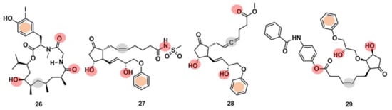 Drug interaction with multiple targets is a cause of drug side effects [146], but it can also be used to increase drug efficacy [147], repurposing [121,148], and design multitarget molecules [149]. Systematic experimental identification of drug targets for NPs or known drugs at the human proteome level is not feasible for the thousands of compounds currently available. Therefore, the development of computational tools to predict the targets of new or known molecules in a systematic way is of high interest [121]. It has been claimed [150] that ML models can point to potential target families and sometimes even to the target subtypes of approximately one-third of the NPs identified to date. Schneider et al. [150] computationally identified and biochemically confirmed an unknown, high-affinity macromolecular target of doliculide (26) (Figure 11), an MNP that is produced by the sea hare Dolabella auricularia. The authors performed automated target prediction with the SPiDER protocol for both doliculide, an NP with strong actin-polymerizing and anticancer activities, and 134 intermediates and precursors of a total synthesis. The SPiDER protocol performs a projection of query compounds, represented by pharmocophore topological descriptors, onto a self-organizing map (SOM) consisting of 120 receptive fields, which was previously trained with pharmacologically active reference compounds and their known targets [149]. The prostaglandin receptors (e.g., EP2, EFP3, and EP4) were predicted as targets not only for doliculide itself but also for most of the synthesis intermediates (100 out of the 134). Doliculide represented a novel chemotype among G-protein-coupled receptor ligands. A flexible three-dimensional pharmacophore alignment was also performed between doliculide (26) and three well-studied, non-selective prostanoid agonists (27–29) (Figure 11). The alignment revealed that the four compounds contain a total of five common pharmacophore points.