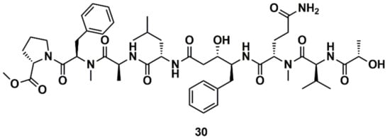 Liu et al. [129] designed, synthesized, and evaluated 19 new derivatives of the MNP tasiamide B (30) (Figure 12) as inhibitors of BACE1, a potential therapeutic target for Alzheimer’s disease. Tasiamide B is an acyclic peptide containing a statine-like unit and several aminoacid residues. The exploration of structure–activity relationship (SAR) with truncated derivatives identified a core structure as well as a free carboxylic acid group important for inhibitory activity. The conclusions were supported by a docking simulation.