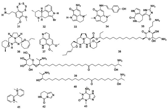 SB computational studies and in vitro experimentation were combined to elucidate the molecular target of 13 low molecular weight MNPs from marine sponges and ascidians. Some are bioactive and the structural similarity to diverse cholinergic ligands anticipated their possible activity towards nicotinic acetylcholine receptors (nAChRs) [127]. In silico docking to the Lymnaea stagnalis acetylcholine-binding protein (AChBP), a model for the ligand-binding domains of nAChRs, was carried out. High affinity was predicted for some compounds, such as the polysulfide varacin (31) and the seven alkaloids pibocin (32), makaluvamines C and G (33, 34), debromohymenialdesine (35), crambescidin 359 (36), aaptamine (37), and monanchocidin (38), while low efficiency of interaction was suggested for other compounds, such as the two sphingolipids rhizochalin (39) and its aglycone (40) as well as the three alkaloids 1,1′-dimethyl-[2,2′]-bipyridyldiium salt (41), 7,8-dihydroimidazo-[1,5-c]-pyrimidin-5(6H)-one (42), and 1,3-dimethylisoguaniniium hydrochloride (43) (Figure 13). The conclusions from computer modelling were verified by radioligand analysis. Nicotinic acetylcholine receptors exhibit multiple conformational states: resting (channel closed), active (channel open), and desensitized (channel closed). Homology modelling was used by Mallipeddi et al. [172] to generate structures of the Torpedo californica α2βδγ nAChR that initially represent the resting state and the desensitized state. Molecular dynamics (MD) simulations were performed on the extracellular ligand binding domain on each nAChR conformational state with and without the agonist anabaseine present in each binding site. Anabaseine (a bipyridine derivative) is a marine alkaloid toxin that acts as an agonist on most nAChRs in the central nervous system. The MD simulations revealed that in the presence of agonist, loop C was drawn inward and attained a more stable conformation [172].