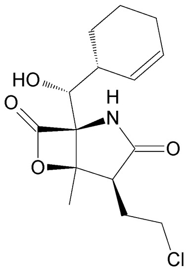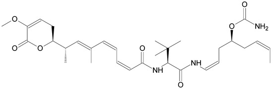 The compounds included in the present review can be grouped together according to their chemical structures. Eribulin belongs to the macrolides [15] (Figure 1), marizomib is a salinosporamide [85] (Figure 2), plinabulin is a piperazine derivative [86] (Figure 3), and PM060184 is a polyketide [15] (Figure 4). The isoquinoline alkaloids include zalypsis, trabectedin, and its structural analogue lurbinectedin [15] (Figure 5). The largest groups are the depsipeptides (didemnin B, elisidepsin, pipecolidepsin A, plitidepsin, and stellatolide A) [15] (Figure 6) and the indolocarbazoles (CEP-2563, enzastaurin, lestaurtinib, midostaurin and UCN-01), all derivatives of staurosporine [87,88], (Figure 7) and becatecarin and edotecarin, derivatives of rebeccamycin [89] (Figure 8).