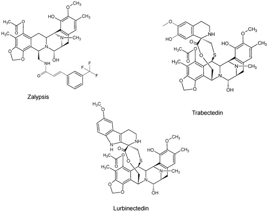 Chemical structures of the isoquinolines zalypsis [39], trabectedin [90], and lurbinectedin [65].