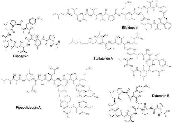 Chemical structures of the depsipeptides didemnin B, elisidepsin [15], pipecolidepsin A [13], plitidepsin [75], and stellatolide A [15].