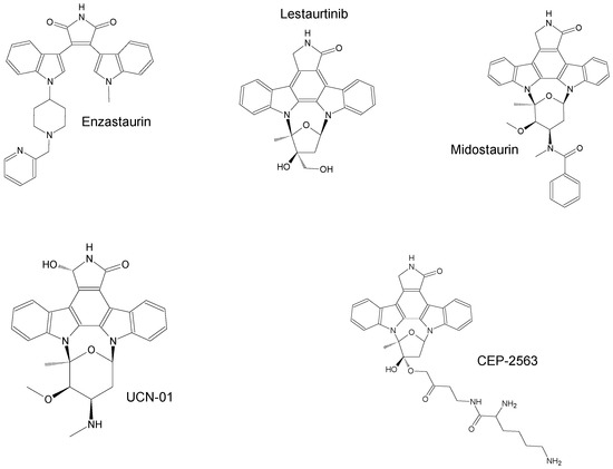 Chemical structures of the staurosporine derivatives CEP-2563 [16], enzastaurin, lestaurtinib, midostaurin, and UCN-01 [91].