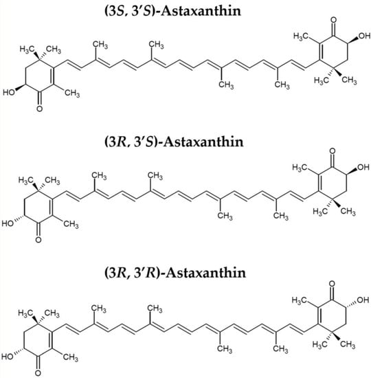 Among carotenoids that have beneficial effects on human health astaxanthin is one of the most successful compounds on the market. Its large scale cultivation mainly from the green microalga H. pluvialis is still considered more expensive [,]. The synthetic production of astaxanthin is still predominant in the market. This synthetic version of the carotenoid is wrongly thought as “a natural equivalent”. Actually, this production process leads to a mixture of astaxanthin isomers, which conferee important molecular and biological differences with respect to the natural carotenoid. In detail, natural astaxanthin (3S, 3′S) is more than 90% esterified, while the synthetic version is all free form, or unesterified. This chemical feature of the natural astaxanthin allows interactions with fatty acids to one or both ends of the compounds, with consequent high bioavailability [].