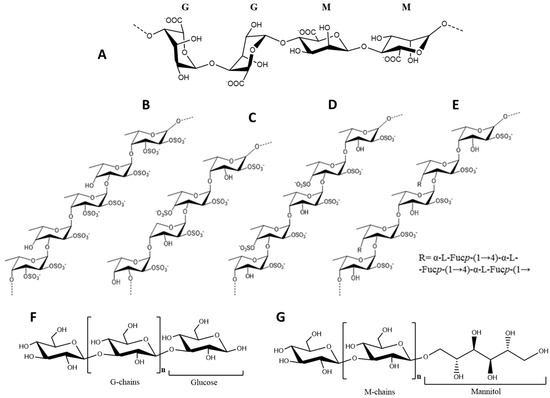 Representative chemical structures of the three main polysaccharides from Fucus: (A) alginic acid; (B–E) fucoidans from F. vesiculosus, F. evanescens, F. distichus and F. serratus, respectively (without representation of acetate groups); (F) G-laminaran; and (G) M-laminaran. Structures redrawn from [3].