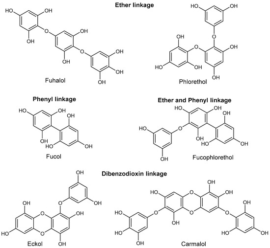Examples of phlorotannin structures grouped according to their type of linkage. Structures redrawn from [251,252].
