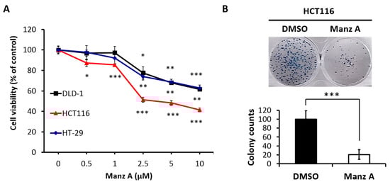 Manz A reduced cell proliferation in colorectal cancer cells. (A) HCT116, DLD-1, and HT-29 cells were treated with Manz A at various concentrations of 0, 0.5, 1, 2.5, and 5 μM for 24 h. Cell viability (%) was measured using MTS cell proliferation assay and data was expressed as percentage of absorbance from Manz A treated cells compared to DMSO treated ones; (B) Colony formation assay was performed to determine the long-term effects of Manz A on the growth of HCT116 cells. Cells were pre-treated with 0.1% DMSO or 5 μM Manz A for 24 h and left for 7 days to grow. Colonies were then stained with Giemsa. The data were expressed as the mean ± SD of three independent experiments. * p < 0.05, ** p < 0.01, *** p < 0.001.