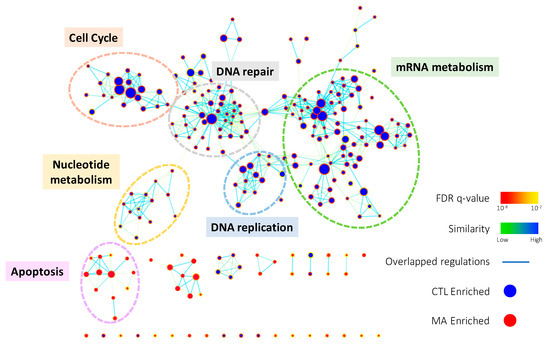 The enrichment map of gene ontology biological processes (GOBPs) enriched in GSEA result. GSEA was performed on microarray data to enrich terms in GOBP. Enrichment results were visualized with Cytoscape 3.0 using Enrichment Map plugin. Each node indicates an enriched term and edges represent overlapped genes between terms. The color of node boarder and edge were shown according to enrichment FDR and similarity, respectively. Blue and red nodes refer to enriched functions in DMSO vehicle control (CTL) and Manz A treatment. The size of node and edge width represents the number of genes enriched in each term and overlapped between terms, respectively.