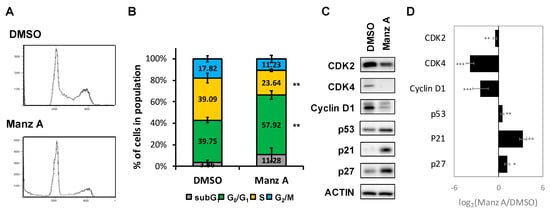 Aberrant cell division and uncontrolled proliferation are often associated with deregulation of cell cycle kinases in cancer cells. Cell cycle progression is regulated by several cyclin-dependent kinases (CDKs) that act in complex with cyclins. Cyclin Ds–CDK4/6 complexes drive cell cycle progression from G0 or G1 phase into S phase, in which DNA replication occurs. The complex sequester CDK inhibitors (CKIs), p21CIP1 and p27KIP1, bind to and prevent activation of cyclin E–CDK2 kinase, driving cell cycle progression from G0 or G1 phase into S phase. While DNA damage occurs, p21 is activated by p53 to arrest cell cycle progression [22]. To determine the effect of Manz A on protein expression of cell cycle regulators, we conducted western blot analysis and found that Manz A obviously decreased the protein expression of CDK2, CDK4 and cyclin D1 and increased levels of CKIs including p21CIP1, p27KIP1, and p53 (Figure 3C). We imply that cell cycle arrest was involved in Manz-A-inhibited cell proliferation.
