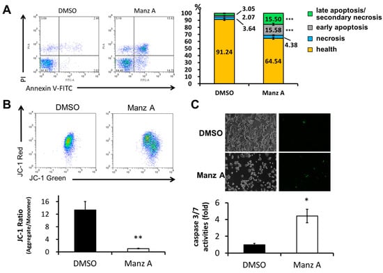 Manz A induced apoptosis in HCT116 cells. Cells were treated with 5 µM Manz A for 24 h. (A) Cells were harvested and stained with Annexin V-FITC and propidium iodide (PI). The fluorescent signal was measured by flow cytometry. A representative result is shown in the left panel and statistics analysis is at the right panel; (B) Cells were subjected to mitochondrial membrane potential detection by JC-1 and flow cytometry; (C) Cells were subjected to caspase 3/7 activity assay by DNA fluorescent dye containing caspase 3/7 cleavage site. Values are expressed as the mean ± SD from three independent experiments. * p < 0.05, ** p < 0.01, *** p < 0.001.