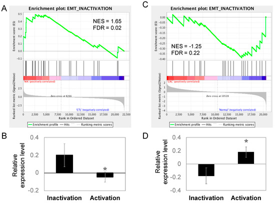 EMT was inactivated in Manz A treated HCT116 cells and normal colorectal tissues. Genes involved in EMT inactivation and activation were collected as two gene sets for GSEA to test the gene expression pattern between (A) MA-treated and DMSO-treated HCT116 cells or (C) the pattern between CRC and healthy control clinical tissues. Relative gene expression was ranked in descending order and colored from red to blue in response to MA (A) or occurrence of disease (C). Green line indicates the profile of running ES score and black lines represent the positions of gene set members on the rank ordered list according to their relative levels in Manz A (MA) compared to DMSO vehicle control (CTL) or CRC tumors (CRC) compared to biopsies from healthy controls (Normal). Relative expression levels of genes involved in EMT inactivation and activation were compared in (B) MA-treated HCT116 and (D) clinical tissues. Data is shown in mean expression of Z-transformed expression level. * p < 0.05.