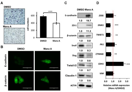 Loss of epithelial cadherin (E-cadherin) is considered to be a critical molecular feature of EMT. E-cadherin acts as a tumor suppressor which inhibits invasion and metastasis. Several signaling pathways including TGFβ, PI3K/AKT, and WNT signaling promote EMT by inhibiting glycogen synthase kinase-3β (GSK3β) to stabilize β-catenin, which translocates to the nucleus to regulate the transcription factors and promote a gene expression profile that favors EMT [23]. Therefore, we assessed the effects of Manz A on cell migration and EMT makers in HCT116 cells. We found that Manz A significantly reduced the migratory ability (Figure 6A). Subsequently, we revealed that Manz A increased E-cadherin expression and inhibited the nuclear translocation of β-catenin (Figure 6B). Moreover, Manz A induced the protein expression of several epithelial markers including E-cadherin and Zona occludens-1 (ZO-1) and reduced that of β-catenin, tight junction protein claudin-1, and EMT transcriptional regulators Snail, Slug, and Twist1/2 (Figure 6C). Simultaneously, CDH1 (encoding E-cadherin), SNAI1, TWIST1, and CTNNB1 (encoding β-catenin) were consistently regulated at the mRNA levels (Figure 6D). Collectively, these results demonstrate that Manz A reverses EMT and drives an epithelial-like phenotype, thereby suppressing the migration of colorectal carcinoma cells.