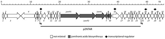 Expression of the JA BGC seems to be regulated, as no JAs are detected in the heterologous host unless its biosynthesis is elicited by ermE*p insertion upstream of jomP1. Gene deletion and overexpression experiments have not demonstrated the direct involvement of putative transcriptional regulators coded in the surroundings of jomP1-jomM on JAs biosynthesis control. Hence, based on these results, presence of key regulators encoded outside the JAs BGC is foreseeable. Lack of essential gene functions in BGC is frequently explained on the basis of large-scale genetic rearrangements, such as inversions and transpositions, which are fundamental to genome evolution [67,68].