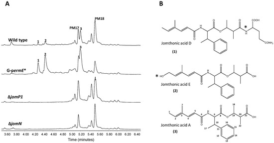 Activation of jomthonic acids biosynthesis. (A) Metabolite analysis by UPLC of Streptomyces caniferus GUA-06-05-006A (wild type), G-perm*strain (constitutive promoter ermE*p inserted) and mutants ΔjomP1 and ΔjomN. Peaks corresponding to PM100117 (PM17) and PM100118 (PM18) are indicated. (B) Chemical structures of jomthonic acid A and novel derivatives D and E. Asterisks indicate structural differences among the three compounds.