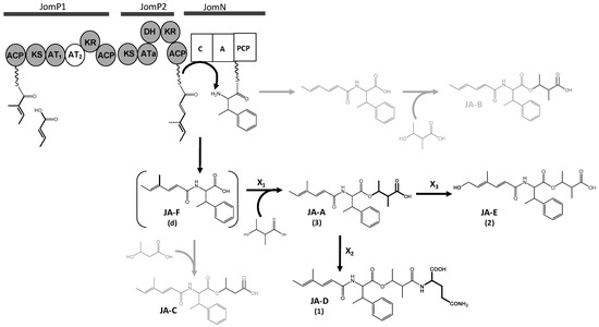 Proposed biosynthesis pathway of jomthonic acids. Polyketide synthase (JomP1 and JomP2) and non-ribosomal protein synthetase (JomN) domains are as follows: KS ketosynthase, AT acyltransferase, KR ketoreductase, DH dehydratase, ACP acyl-carrier-protein, C condensation, Aadenylation, PCP peptidyl carrier protein. Compounds not detected in S. caniferus GUA-06-05-006A are shown in grey. Parentheses indicate structures not confirmed by NMR. Genes coding for enzymes X1, X2 and X3 were not identified in the biosynthesis gene cluster.