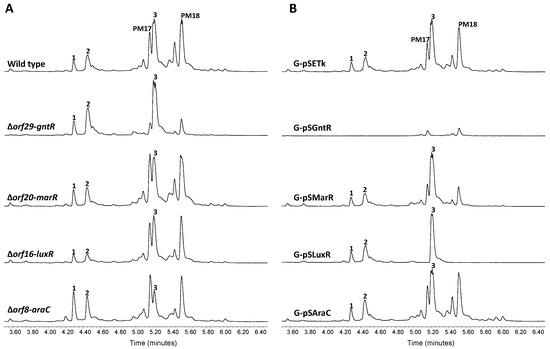 Cluster boundaries analysis. UPLC analysis of jomthonic acids production in (A) Streptomyces caniferus GUA-06-05-006A (wild type) and mutant strains ∆orf29-gntR, ∆orf20-marR, ∆orf16-luxR and ∆orf8-araC, and (B) Streptomyces caniferus GUA-06-05-006A carrying overexpression plasmids pSETk (empty plasmid), pSEGntR (orf29), pSEMarR (orf20), pSESARP (orf16) and pSEAraC (orf8). Peaks corresponding to PM100117 (PM17) and PM100118 (PM18) are indicated.