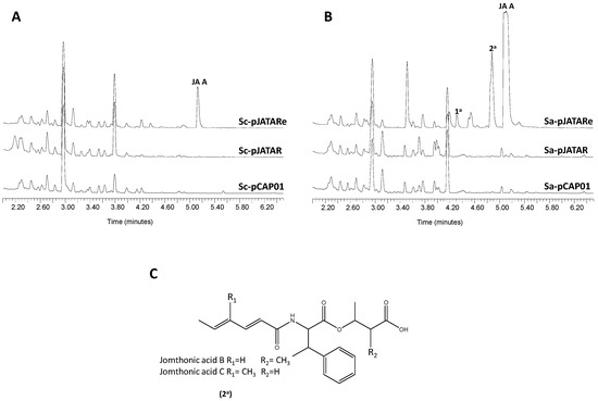 Heterologous expression of the jomthonic acids biosynthesis gene cluster. UPLC metabolite analysis of (A) Streptomyces coelicolor M1152 and (B) Streptomyces albus J1074 carrying plasmid pCAP01 (empty plasmid), pJATAR (JAs BGC) and pJATARe (JAs BGC with ermE*pinserted). (C) Speculative chemical structure of peaks 2a (jomthonic acids B or C) in S. albus J1074.