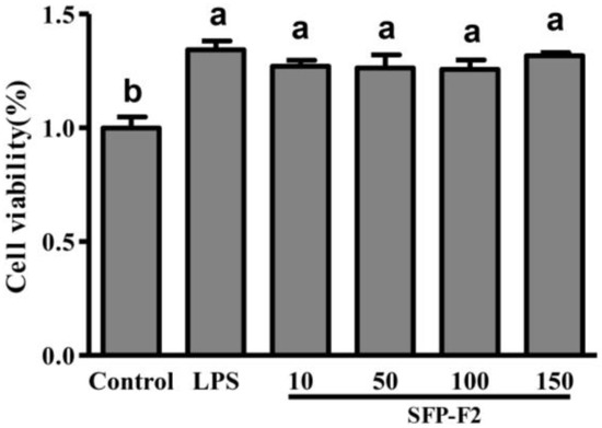 Effect of SFP-F2 on the viability of RAW 264.7 cells. RAW 264.7 cells were seeded in 96-well plate and cultured until 70–80% confluency. The cells were then treated with 1 μg/mL lipopolysaccharides (LPS) or with different concentrations of SFP-F2 in DMEM medium for 12 h. The cells were then subjected to MTT assay to assess their viability. Data are presented as the means ± SDs from three independent experiments. Means with different alphabet (a, b) indicate a significant difference at p < 0.05 on the cell viability of polysaccharides between groups with the Tukey-Kramer test.
