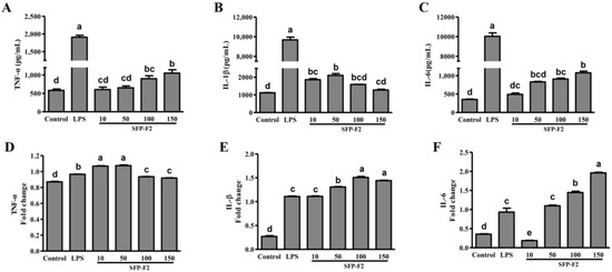 The effect of SFP-F2 on cytokines released by RAW264.7 cells following treatment with the polysaccharide was determined by ELISA. TNF-α levels were significantly increased by treatment with SFP-F2 at 100 μg/mL and 150 μg/mL (Figure 3A). Similarly, the levels of IL-1β and IL-6 were also increased by treatment with SFP-F2 (Figure 3B,C), with IL-1β level peaked at 50 μg/mL SFP-F2. LPS (used as positive control) had a much stronger stimulating effect on the translational levels of TNF-α, IL-1β and IL-6 in RAW264.7 cells compared to SFP-F2. The effect of SFP-F2 on the transcript levels of TNF-α, IL-1β and IL-6 in RAW264.7 cells was also investigated by reverse transcription PCR assay, which revealed significant increase in the transcript levels of the three cytokines in the cells treated with SFP-F2 compared to the control cells. Taken together, the results showed that treatment of RAW264.7 cells with SFP-F2 led to increased secretions of immune response-related cytokines.