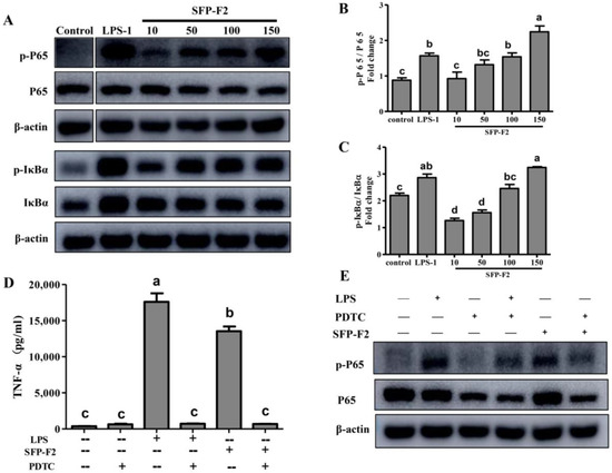 SFP-F2 upregulated the phosphorylation of the P65 (p-P65) and IκBα (p-IκBα) in a dose-dependent manner (Figure 4A). RAW264.7 cells treated with 150 μg/mL SFP-F2 exhibited a significant increase in p-P65/P65 and p-IκBα/IκBα ratios (Figure 4B,C). Furthermore, as shown in Figure 4C, PDTC significantly suppressed the expression level of TNF-α even in the presence of LPS or SFP-F2. Both P65 and p-P65 were significantly down-regulated by PDTC treatment (Figure 4D). The data suggested that the immuno-stimulating effect of SFP-F2 was suppressed by PDTC. Collectively, the results indicated that SFP-F2 might activate the NF-κB signaling pathway in RAW264.7 cells via induction of P65 phosphorylation.