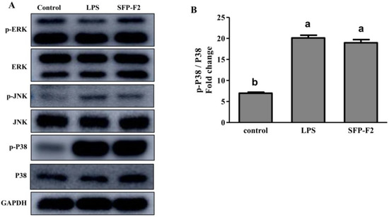 Selective activation of P38 in the MAPK signaling pathway induced by SFP-F2. RAW 264.7 cells were seeded in 10-cm dishes and cultured until 70–80% confluency, and then treated without (control) or with 1 μg/mL LPS or 150 μg/mL SFP-F2 for 12 h. (A) Blot showing the levels of phosphorylated and non-phosphorylated proteins in response to LPS and SFP-F2 treatments. (B) Comparison of the levels of phosphorylated P38 relative to the levels of non-phosphorylated P38 in grey scale (B). Data are presented as the means ± SDs from three independent experiments. Means with different alphabet (a, b) indicate a significant difference at p < 0.05 on p-P38/P38 ratio between groups with the Tukey test.