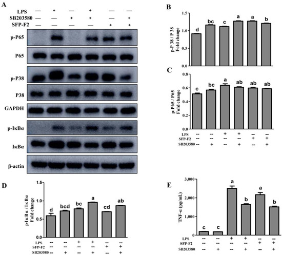 Macrophages are the primary effector cells that interact with the CD14 receptor and activate the NF-κB/mitogen-activated kinase (MAPK) signaling pathway in the innate immune response [19]. The MAPK cascade pathways response to extracellular signals by activating various transcription factors and gene expression [20,21]. JNK, ERK, and P38 are the main members of the MAPK family [22]. RAW264.7 cells treated with SFP-F2 or LPS showed remarkable up-regulation of P38 phosphorylation, with a slight increase in expression of JNK (Figure 6A,B), suggesting that P38 was more sensitive to stimulation by SFP-F2. However, in the presence of SB203580, the upregulation of P38 phosphorylation induced by SFP-F2 was significantly suppressed (Figure 7A,B). Furthermore, the level of secreted TNF-α was dramatically decreased (Figure 7E) corresponding to a slightly reduced phosphorylation level of P65 (Figure 7C). Despite being treated with SFP-F2 and SB203580, an increase in IκBα phosphorylation was still observed (Figure 7A). Intriguingly, the results demonstrated that IκBα was not intensively regulated by P38 in the presence of SFP-F2, which further confirmed that IκBα deficiency did not affect the activation of the NF-κB signaling pathway by SFP-F2 (Figure 5). More importantly, P38 seemed to play a role of an upstream regulatory protein of p65 in the immune-stimulating effect of SFP-F2.