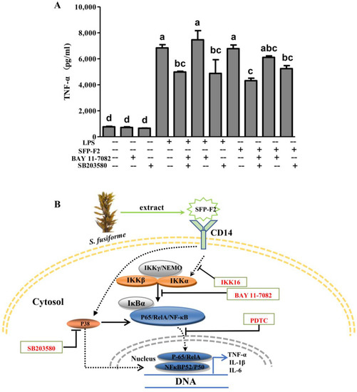 Effect of SFP-F2 on TNF-α release by RAW264.7 cells in the presence of inhibitors against the P38/NF-κB Signaling pathways. (A) ELISA assay of TNF-α released by RAW264.7 cells treated with SFP-F2 in the absence and presence of the inhibitors. RAW264.7 cells were seeded in 10-cm dishes and cultured until 70–80% confluency, and then treated with 2 μM SB203580 plus 10 μM BAY 11-7082 for 2 h followed by treatment without or with 1μg/mL LPS or 150 μg/mL SFP-F2 for another 3 h. (A) TNF-α levels secreted by the cells from different treatments as determined by ELISA. Data are presented as the means ± SDs from three independent experiments. Means with different alphabet (a-d) indicate a significant difference at p < 0.05 between groups with the Tukey-Kramer test. (B) The proposed mechanism for the immuno-stimulating activity of SFP-F2 in RAW264.7 cells. Solid arrow indicates direct stimulatory modification; dotted arrow indicates tentative stimulatory modification (in the cytosol) and translocation (in the nucleus); blocked arrow indicates direct inhibitory modification.