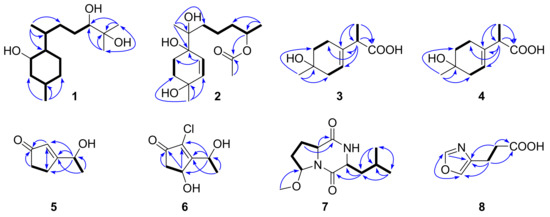 Key HMBC (arrows) and COSY (bold lines) correlations of 1–8.